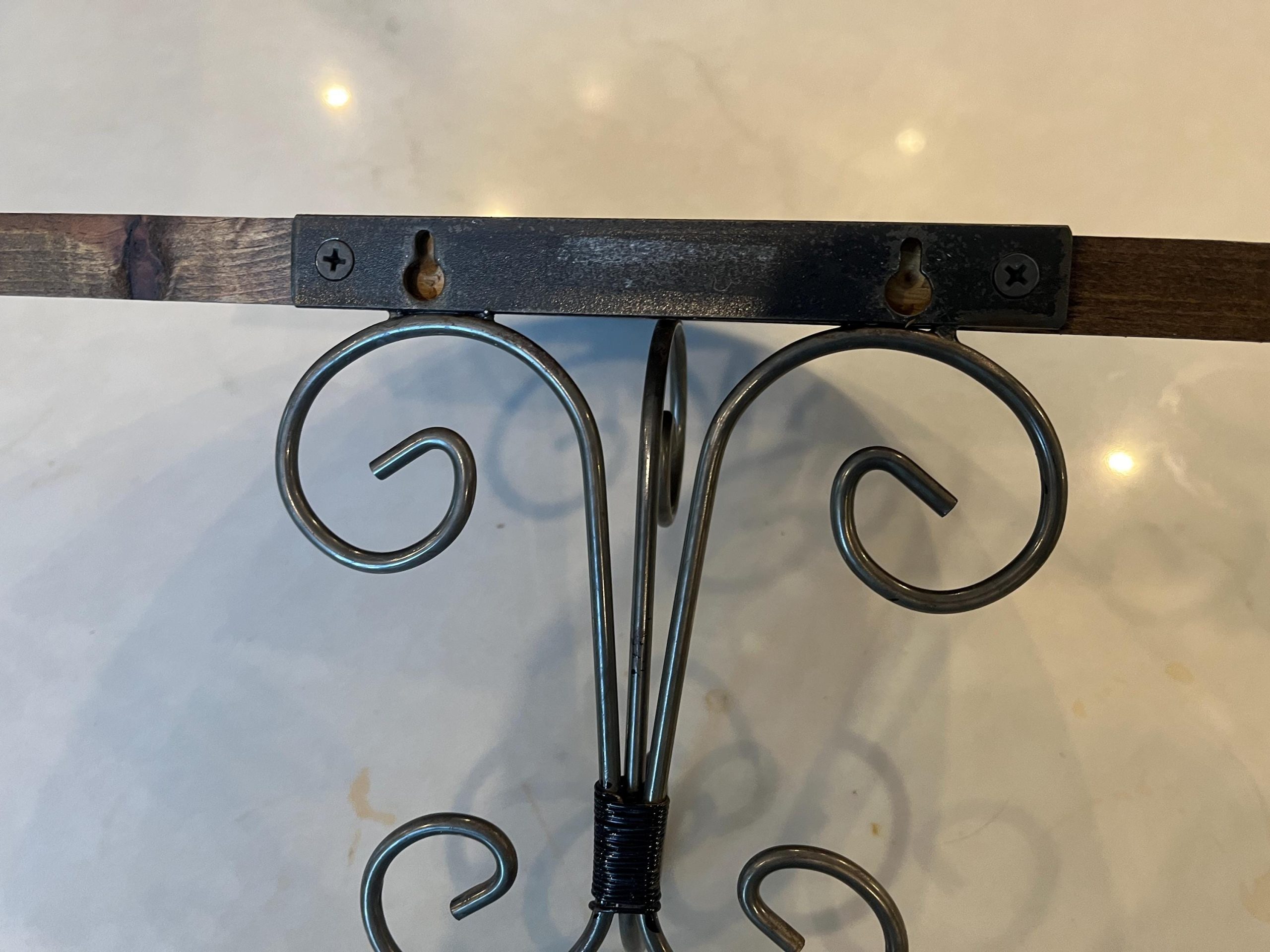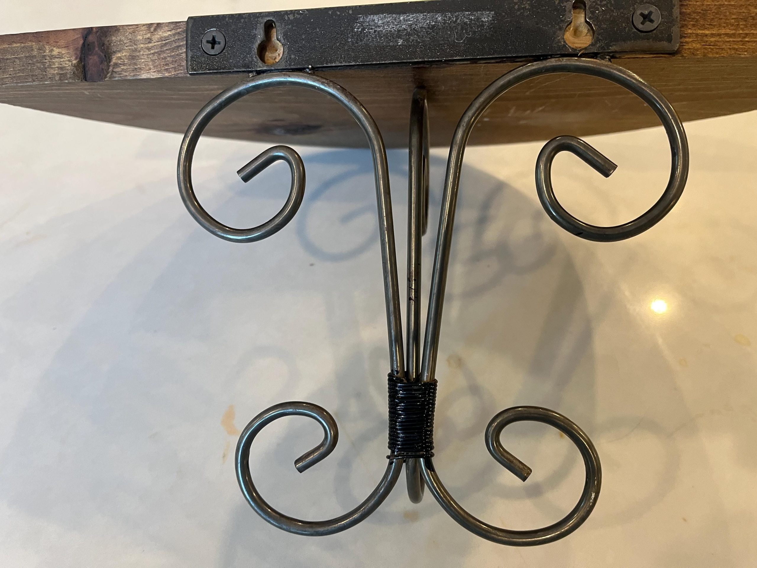 This lovely small wood and wire shelf measures 14 inches wide by 7 inches deep and 7 inches high. The perfect small shelf for a hallway or by the door. Two slots are provided on the back for easy hanging.