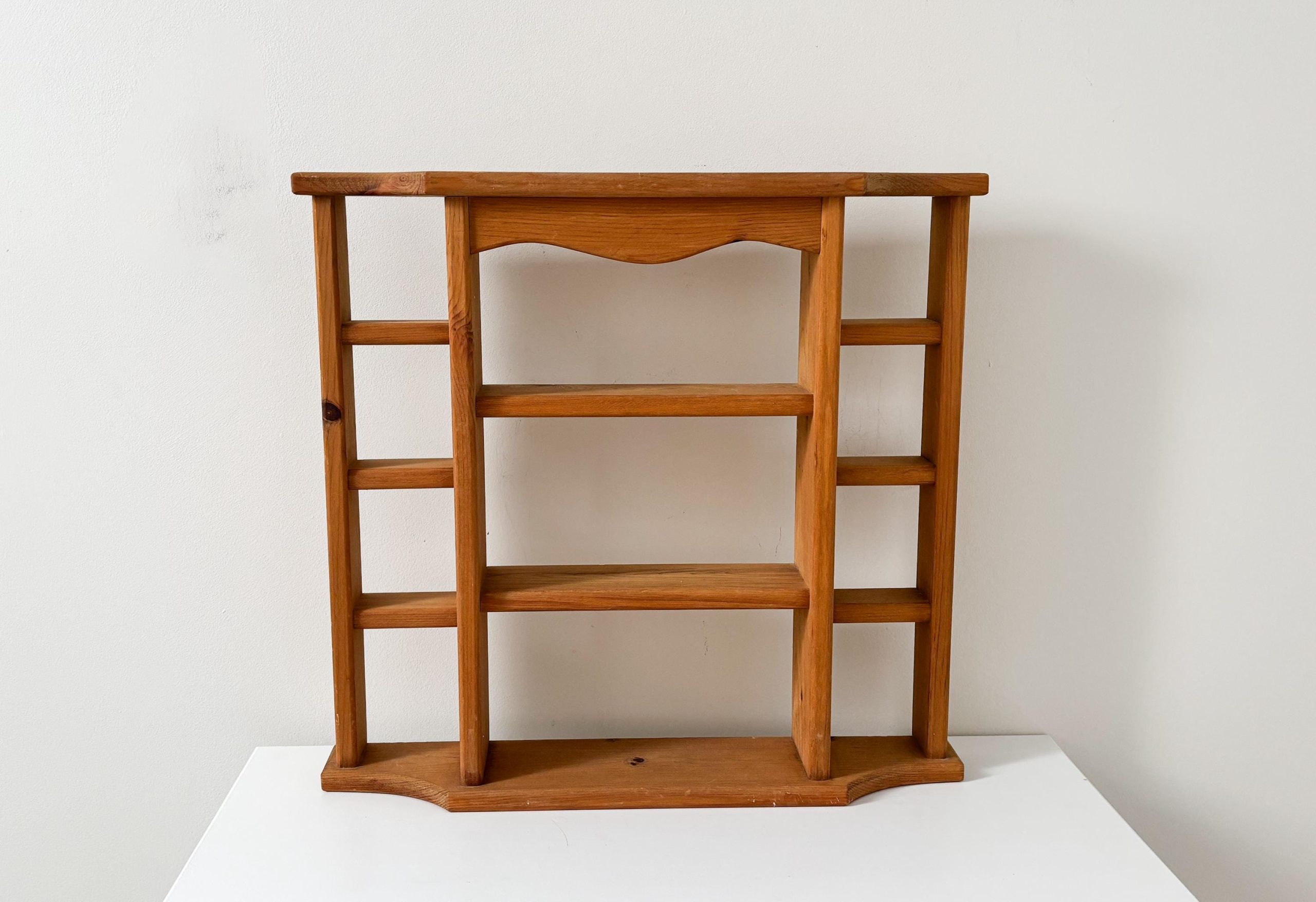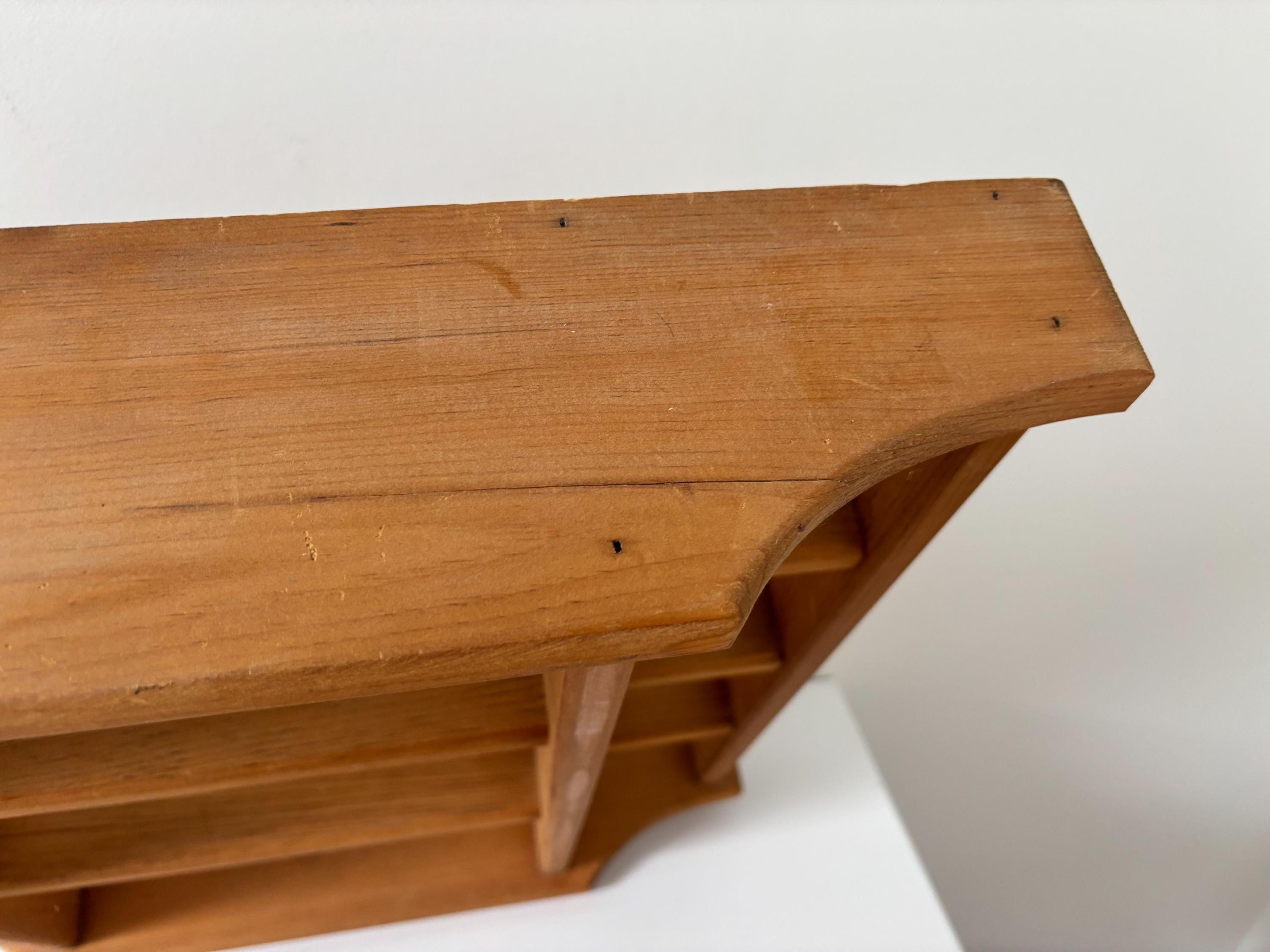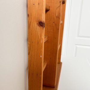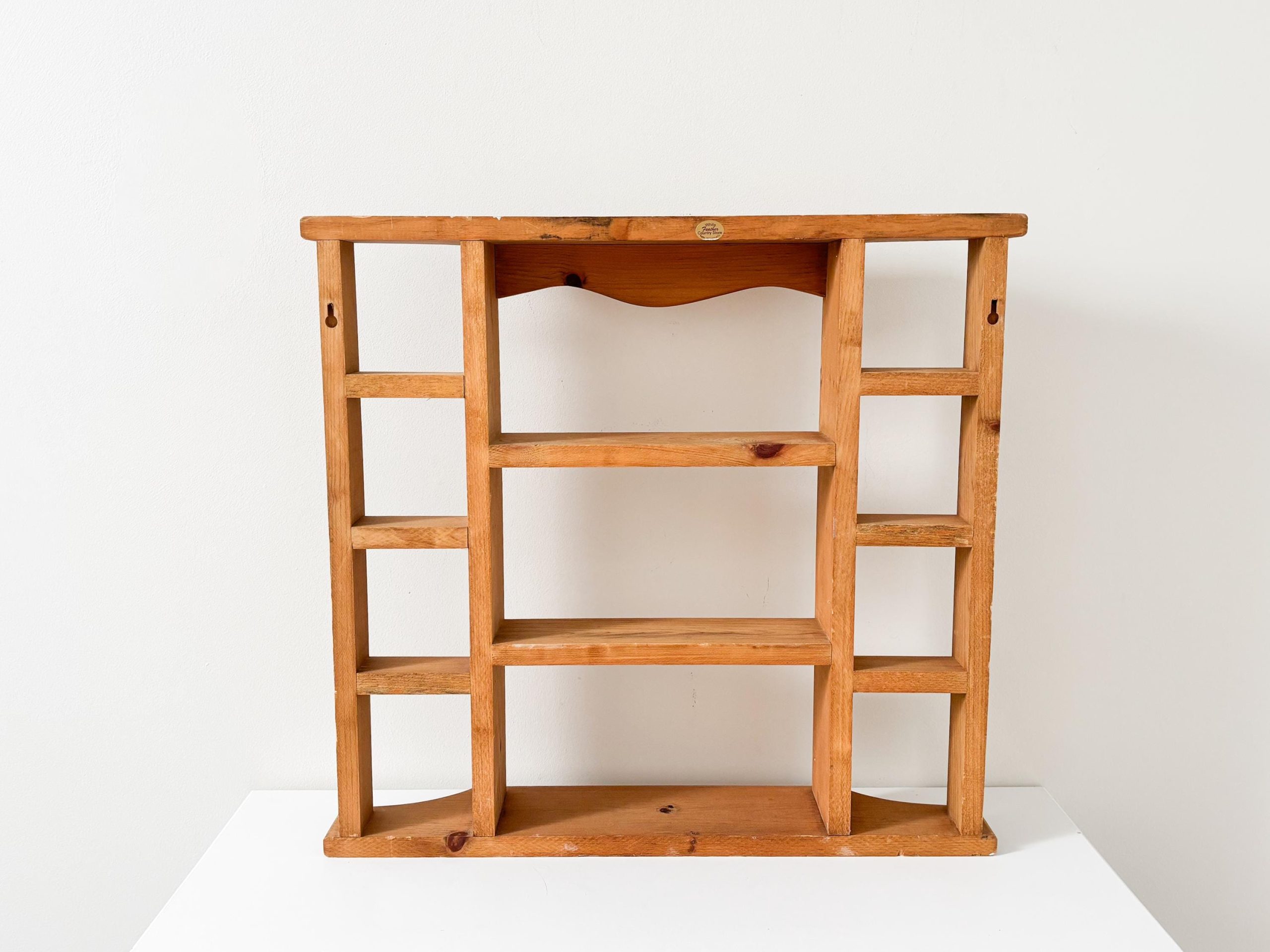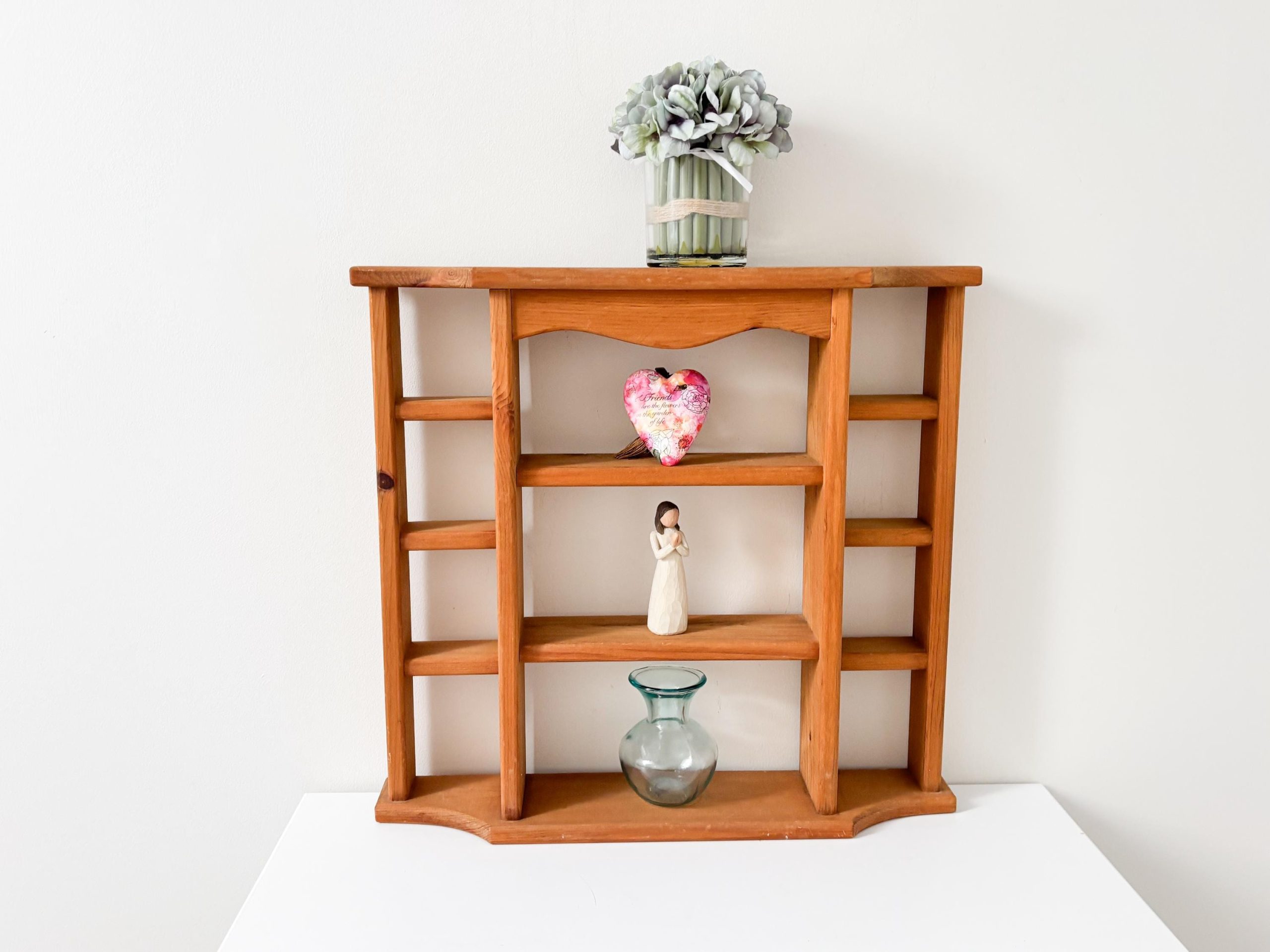 Showcase your favorite small items with this charming vintage floating shelf, crafted from solid 0.75” natural wood. The piece features three vertical rows of shelves, offering the perfect display space for trinkets, spices, essential oils, collectibles, or small bathroom and kitchen items.